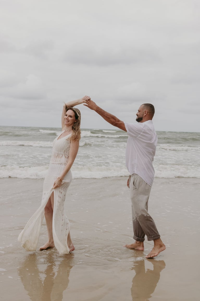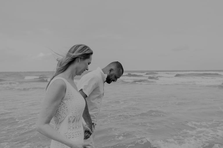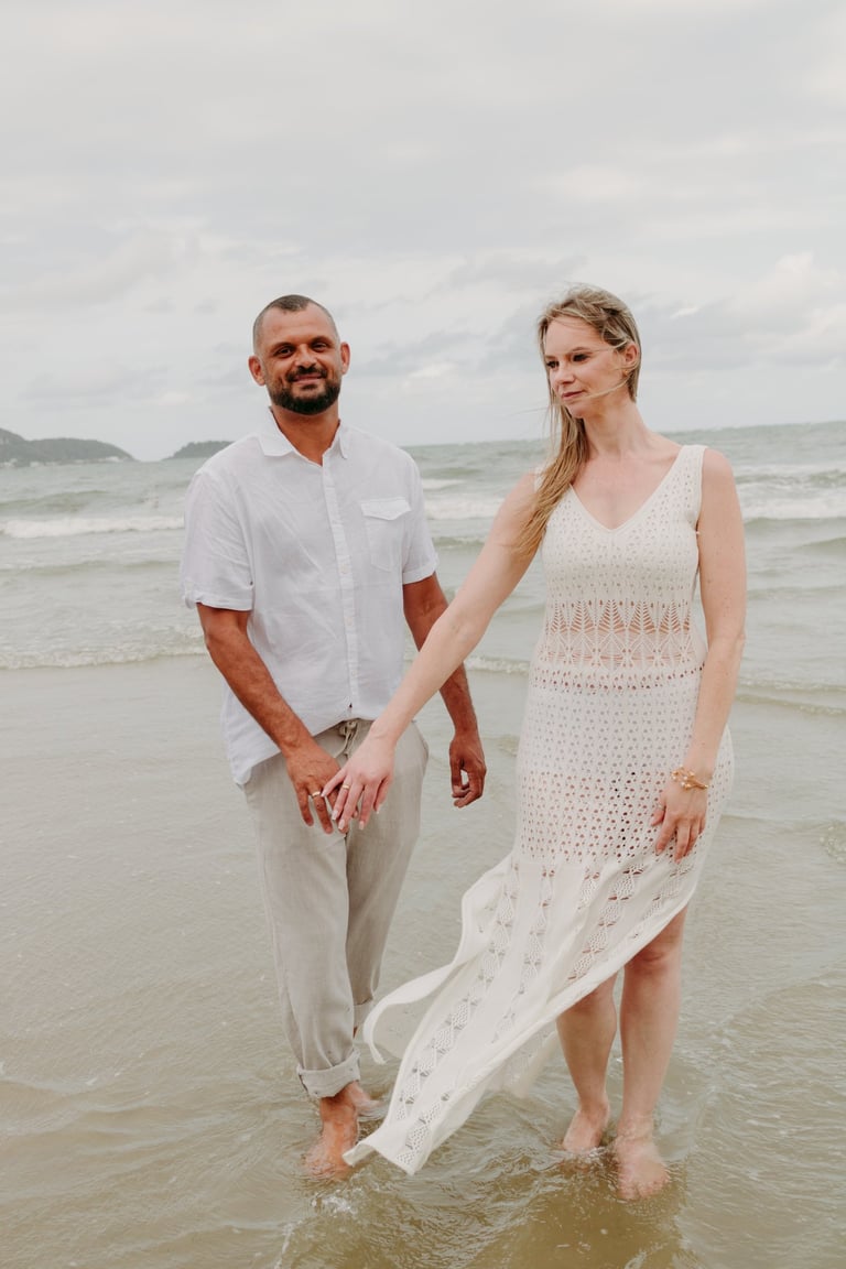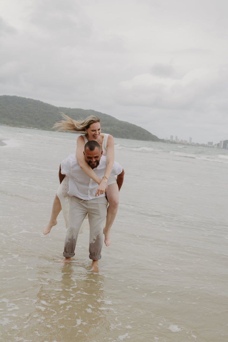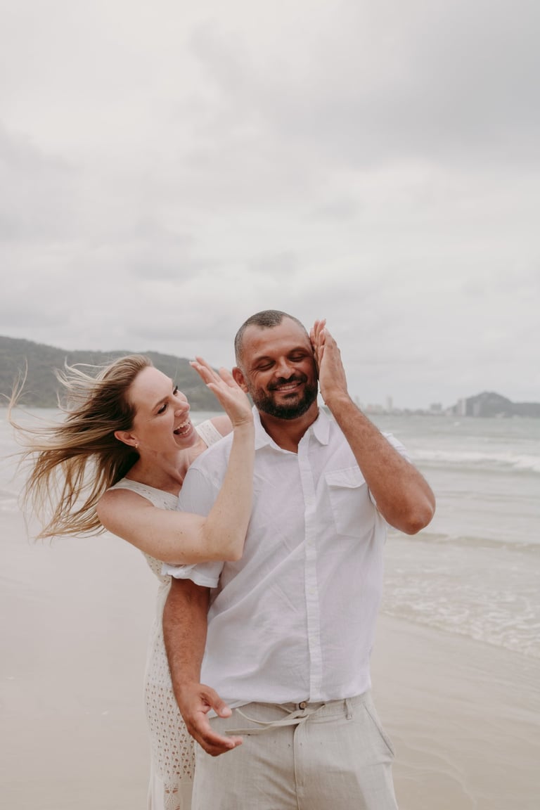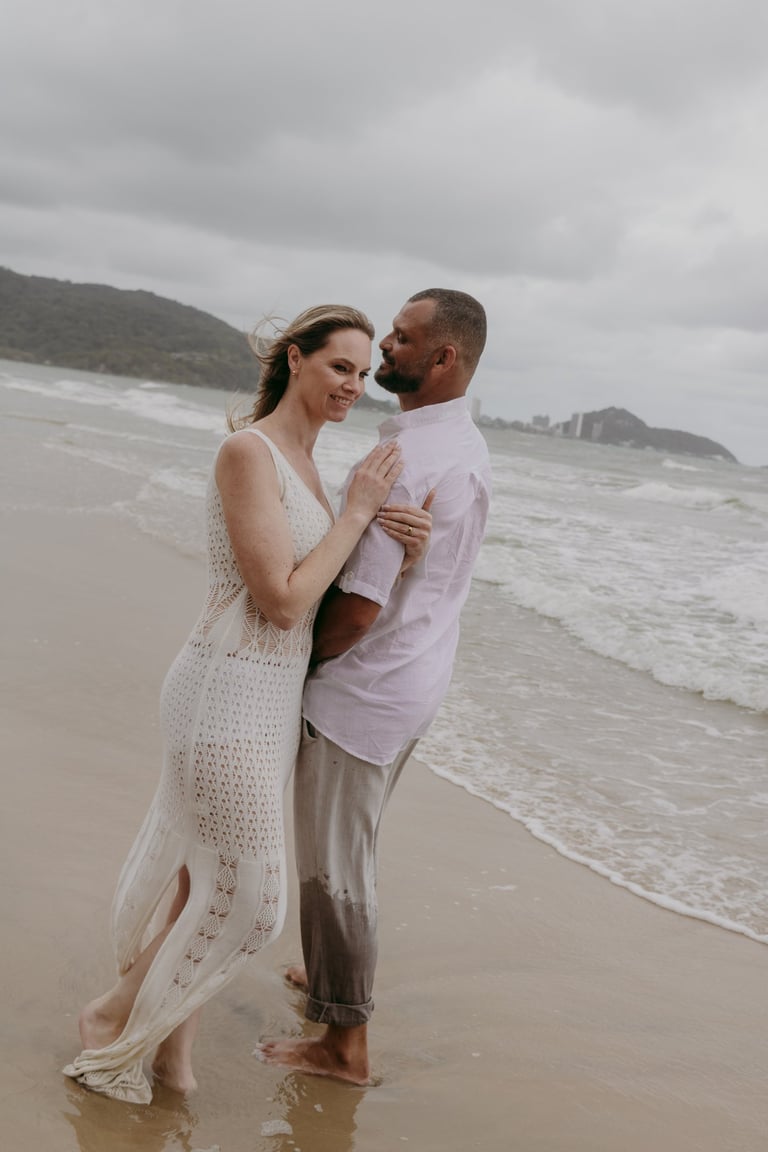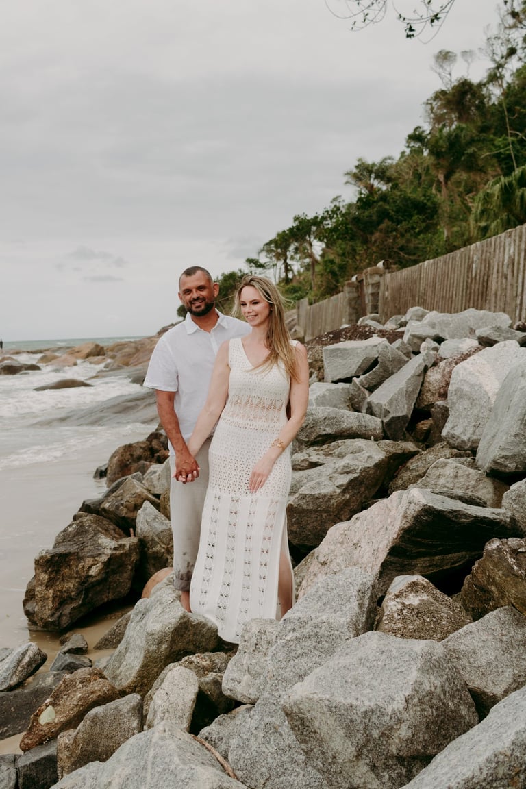 Esse casal escolheu a praia para viver momentos importantes da sua história, do pedido de noivado ao pré-wedding. O ensaio foi marcado pela leveza do lugar, pela tranquilidade dela e pelo jeito brincalhão dele, resultando em registros naturais e cheios de conexão.